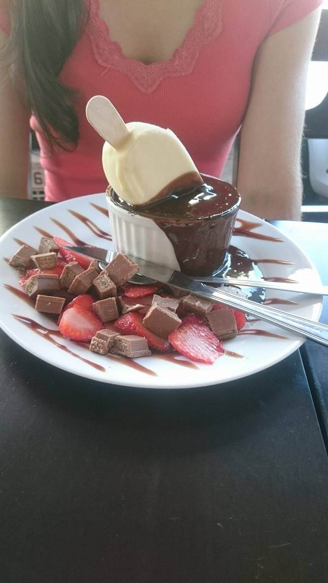 (Hahah) Eu que não sou boba, pedi logo um Grand Gateau - é tipo um petit gateau, só que maior, vem com um picolé (você escolhe o sabor chocolate branco ou preto) e pode vir acompanhado de frutas e/ou chocolates (eu escolhi morangos e kit kat). Preço: R$ 21,99. O acompanhamento escolhido pode trazer variações no preço.
